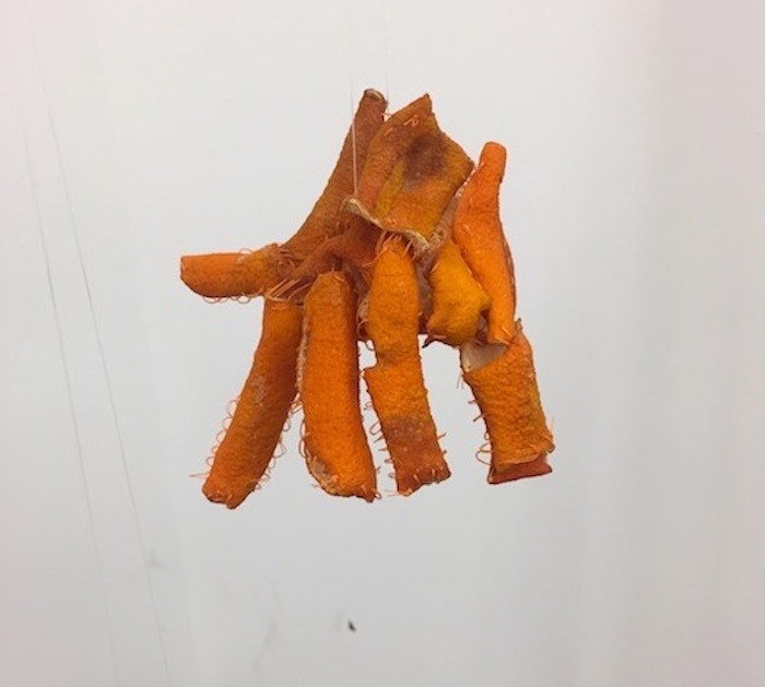 The series of orange peel sculptures express the obsession and connection with orange. Started in 2017, the study of orange peel as material and as a concept was Haneda's main practice and motivation for creating art. The work is durational and meditative because of the material, the process, the work's decay, and semi-permanency, which reflects on the notion of body and nature.